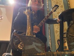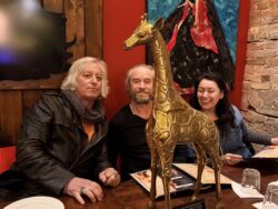 “Pictured: me with new haircut, my new giraffe and my Balinese temple horse. All preparing to hit the road! Berkeley Tuesday. Will possibly have more pointless stage animals.” -Peter